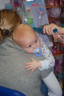 We FINALLY did it!!! Gone are the mullet wearing days for Addison! We took her to Kidsnips last Saturday and figured it would be fun (although unnecessary since we could have done the few snips at home) to take her in for her first official haircut. Well- it turned out to be rather tragic for poor Addison. We walked in and she was terrified from the start. She wouldn't sit in one of the cars, wouldn't wear a little cape, could care less that Elmo was on, and wouldn't sit still for one split second. I had to hold her and she cried on my shoulder the whole time- bless her heart! It made for an interesting photo op I guess. The good news is that instead of being charged $20 we were only charged $5- because she "has no hair!"